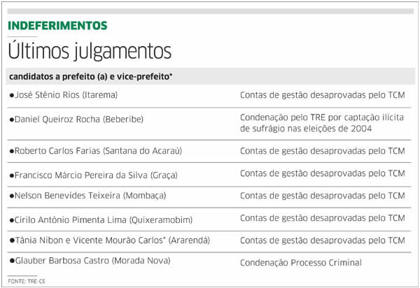 Na sessão de ontem, o TRE julgou 28 recursos eleitorais referentes ao registro de candidatos a prefeito, vice-prefeito e vereador no Ceará. Dentre os candidatos da majoritária que tiveram o registro indeferido em razão da aplicabilidade da Lei da Ficha Limpa, estão: José Stênio Rios, de Itarema; Daniel Queiroz Rocha, de Beberibe; Roberto Carlos Farias, de Santana do Acaraú; Francisco Márcio Pereira da Silva, de Graça; Nelson Benevides Teixeira, de Mombaça; Cirilo Antônio Pimenta Lima, de Quixeramobim; Tânia Paiva Nibon Mourão e Vicente Mourão Carlos, de Ararendá; Glauber Barbosa Castro, de Morada Nova.