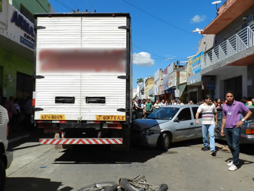 Um acidente com bastante danos materiais e lesões corporais leves foi registrado por volta do meio dia desta sexta-feira entre os bairros Seminário e Centro de Crato. Um caminhão F 4000 de cor vermelha e placas KSV-8009, inscrição do Ceará, que descia a ladeira da Rua Coronel Luiz Teixeira, em frente ao Armazém Pernambucano, perdeu o controle e atingiu cinco carros, uma motocicleta e ainda deixou três pessoas com escoriações leves pelo corpo.